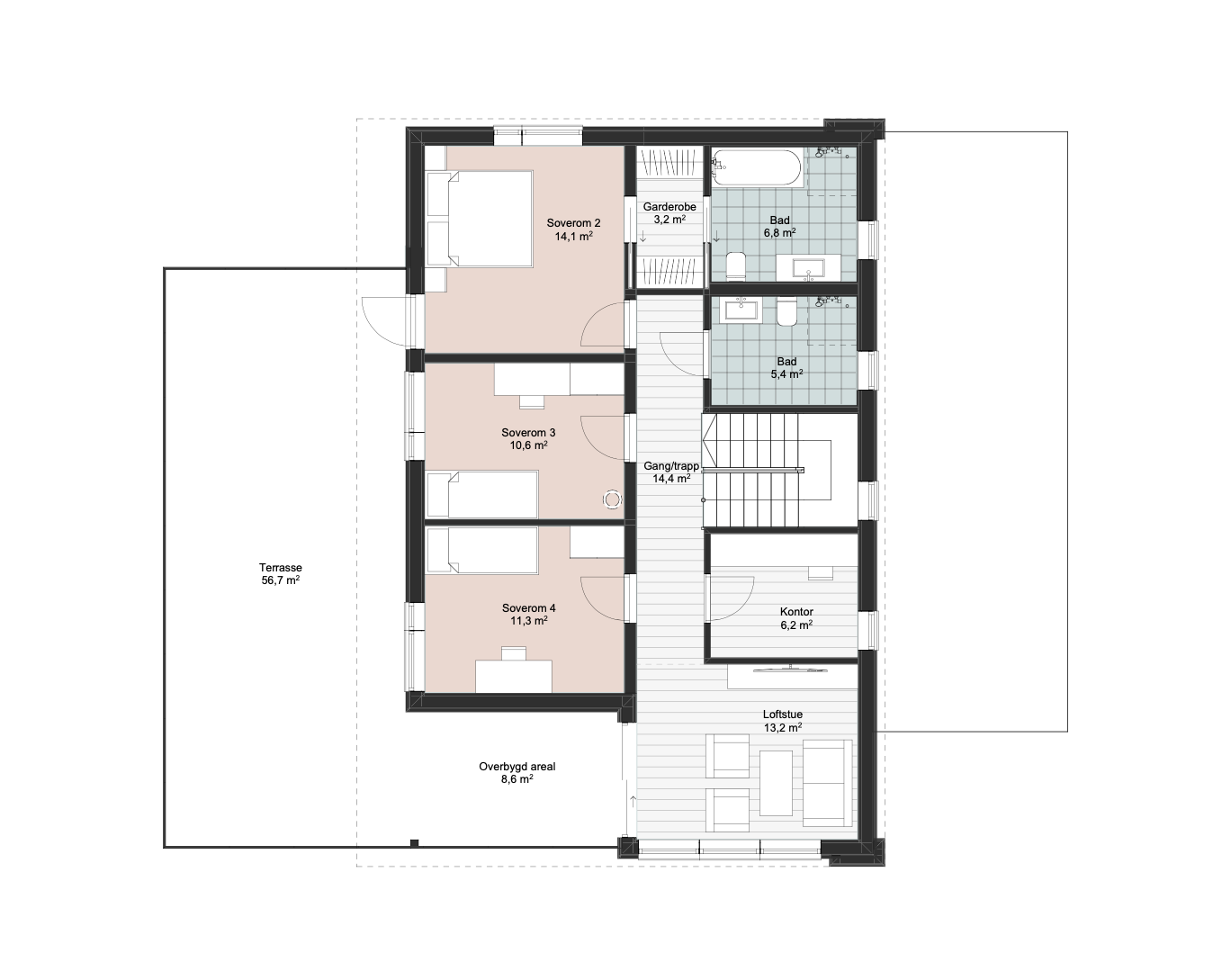 I andre etasje ligger hovedsoverommet med eget bad, garderoberom og utgang til takterrassen. I tillegg finnes to soverom, et kontor, et ekstra bad samt en TV-stue med direkte utgang til en stor takterrasse.