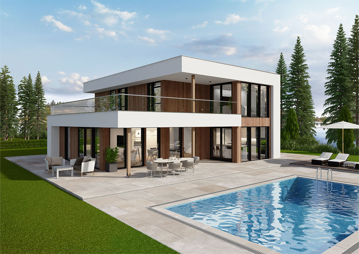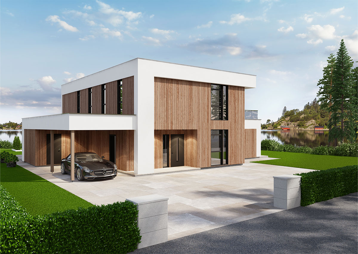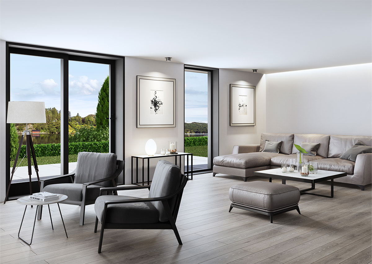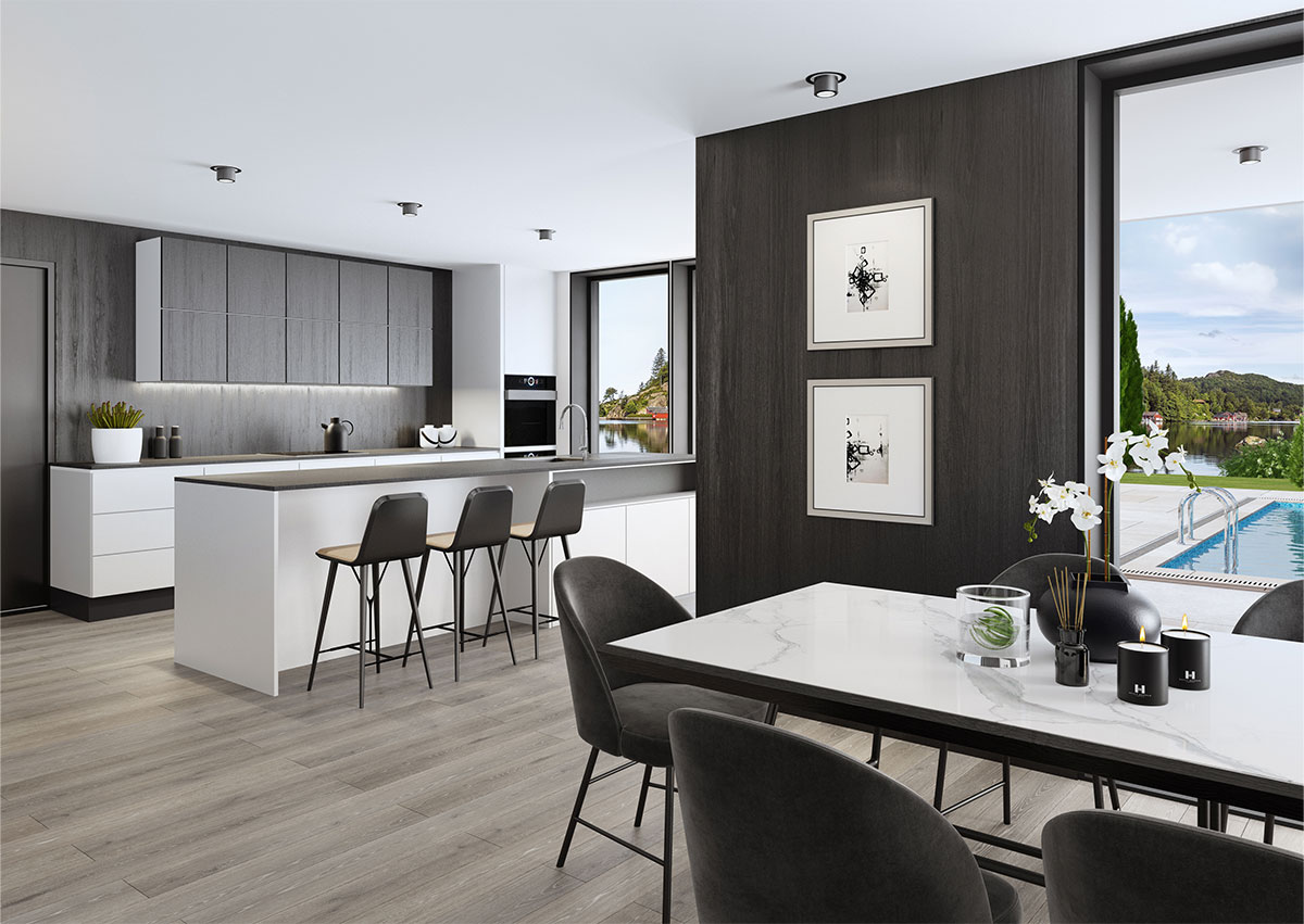Besseggen er en moderne enebolig med tydelige arkitektoniske linjer, materialiteten og det stramme formspråket gir boligen et lyst og luftig preg.