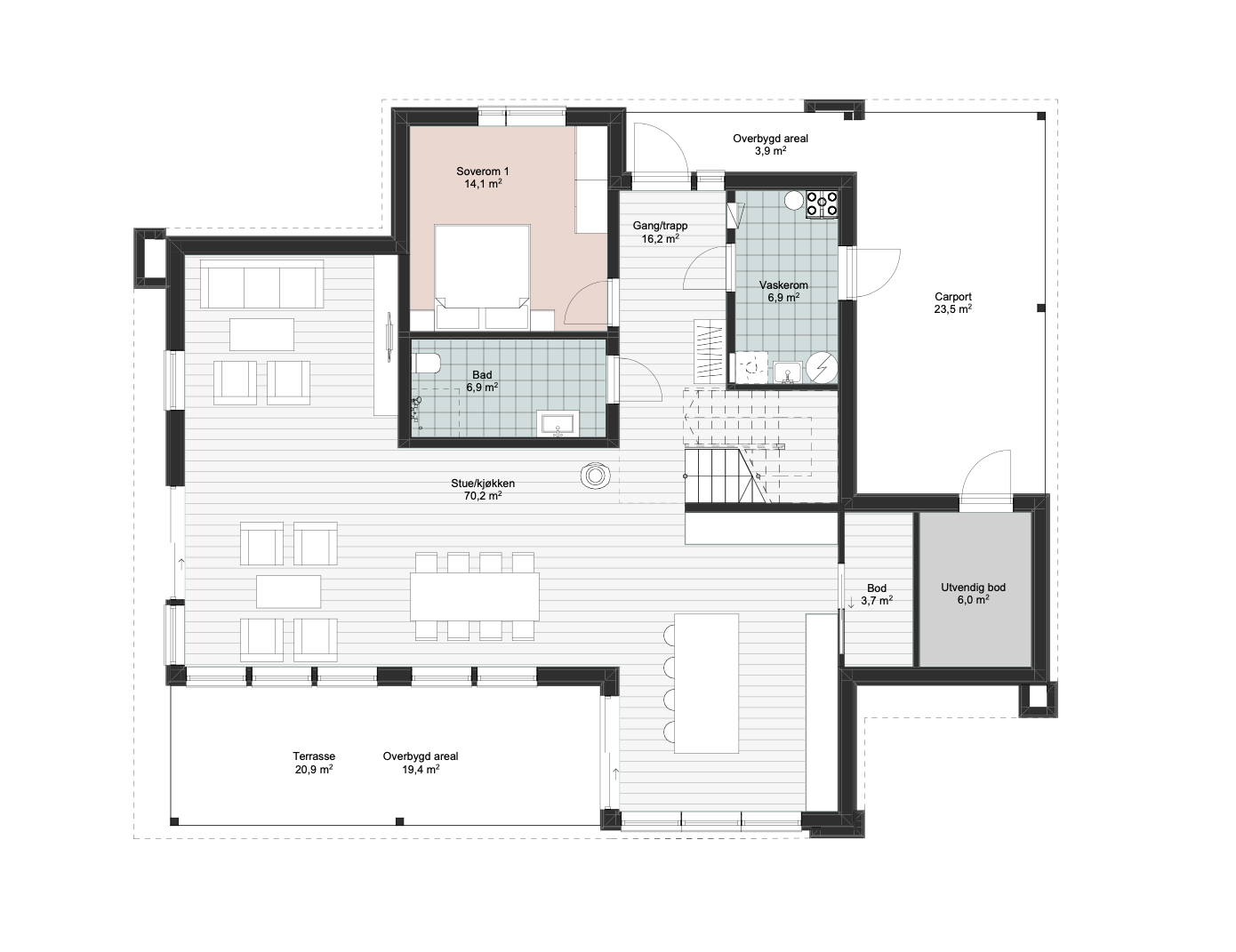 Fra stuen er det utgang til en overbygd terrasse, som gir en sømløs overgang mellom inne- og uterom.