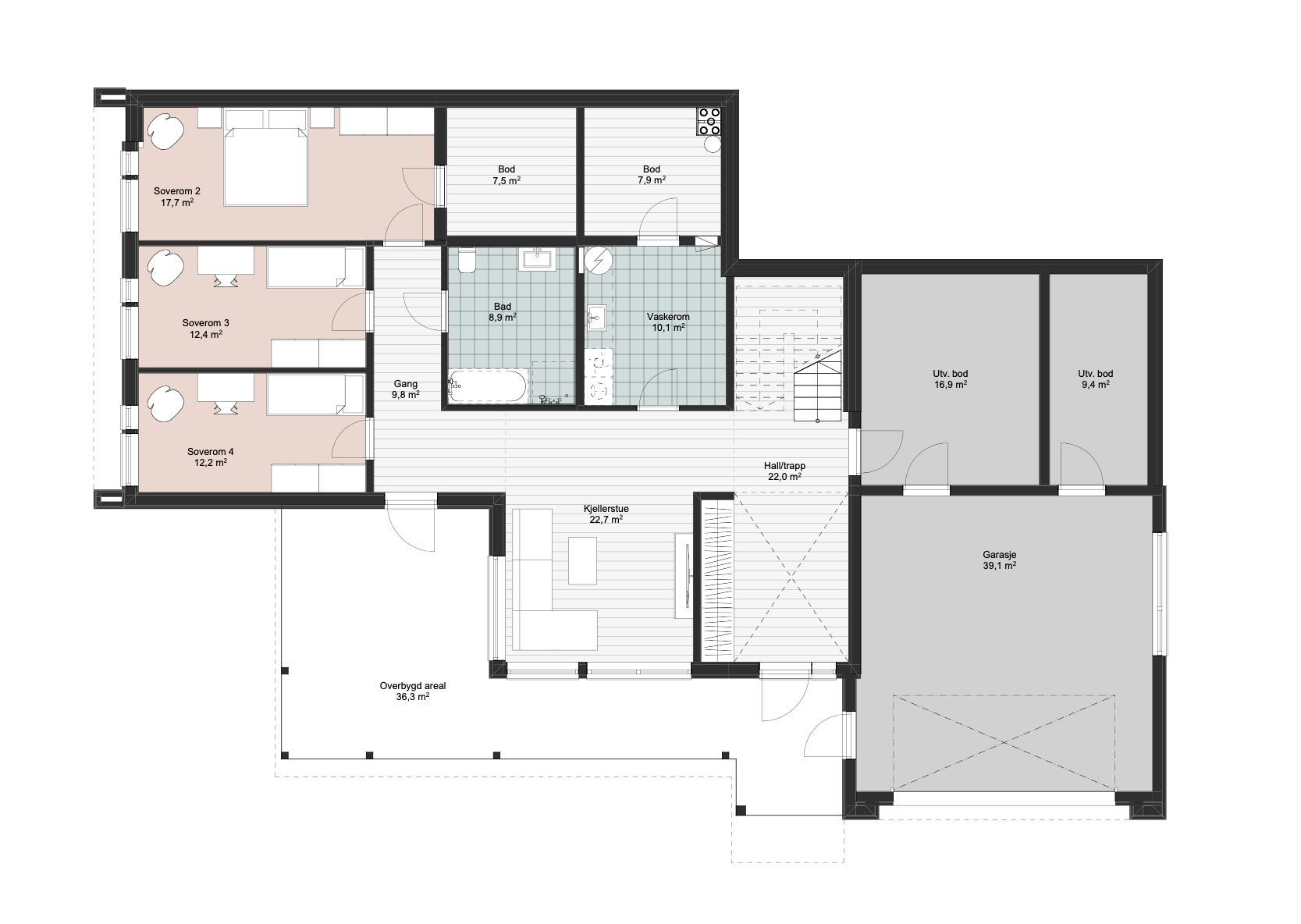 På inngangsplanet finner man en integrert garasje med plass til to biler, med direkte adkomst inn i boligen – en praktisk detalj i hverdagen. Her ligger også en egen TV-stue, tre soverom, bad og et separat vaskerom.