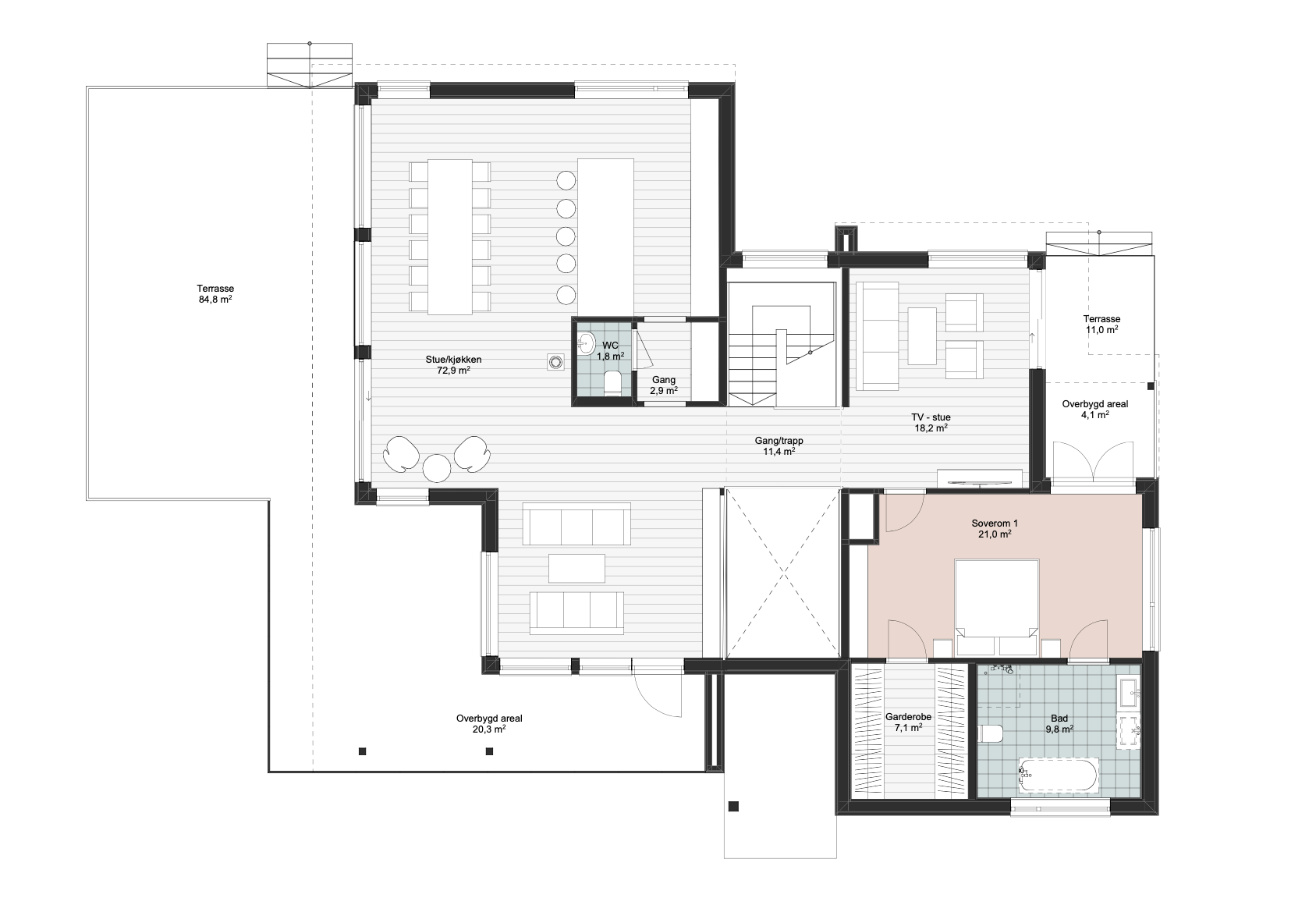 I tillegg finnes det en ekstra stue som gir mulighet for en mer tilbaketrukket sone. Hovedsoverommet har tilknyttet garderoberom og eget bad. Glittertind er ikke bare en moderne bolig – det er et hjem med særpreg og kvaliteter som gjør det både praktisk og inspirerende å bo i. Her er det lagt vekt på gode løsninger, lys og rom, samt et design som gir deg en unik bolig.
