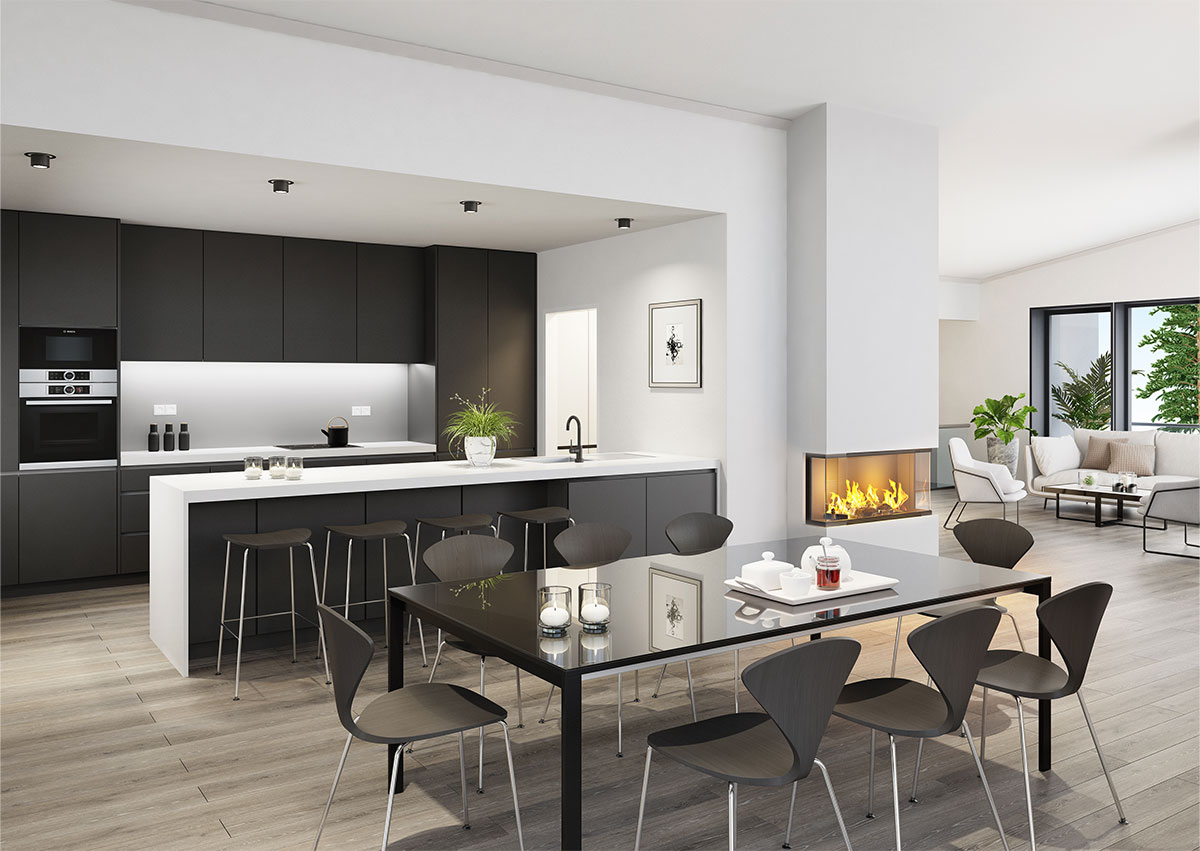 I andre etasje åpner boligen seg opp med en stor og lys stue- og kjøkkenløsning.