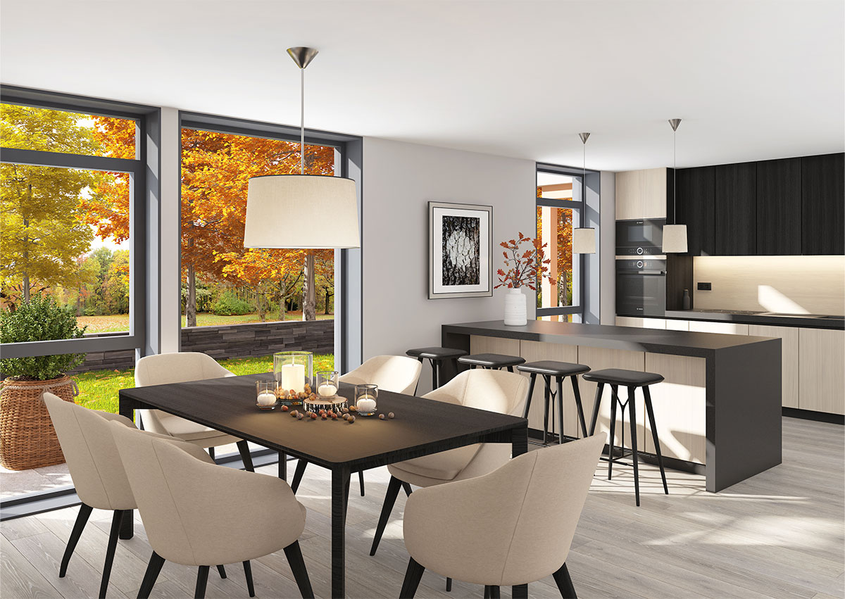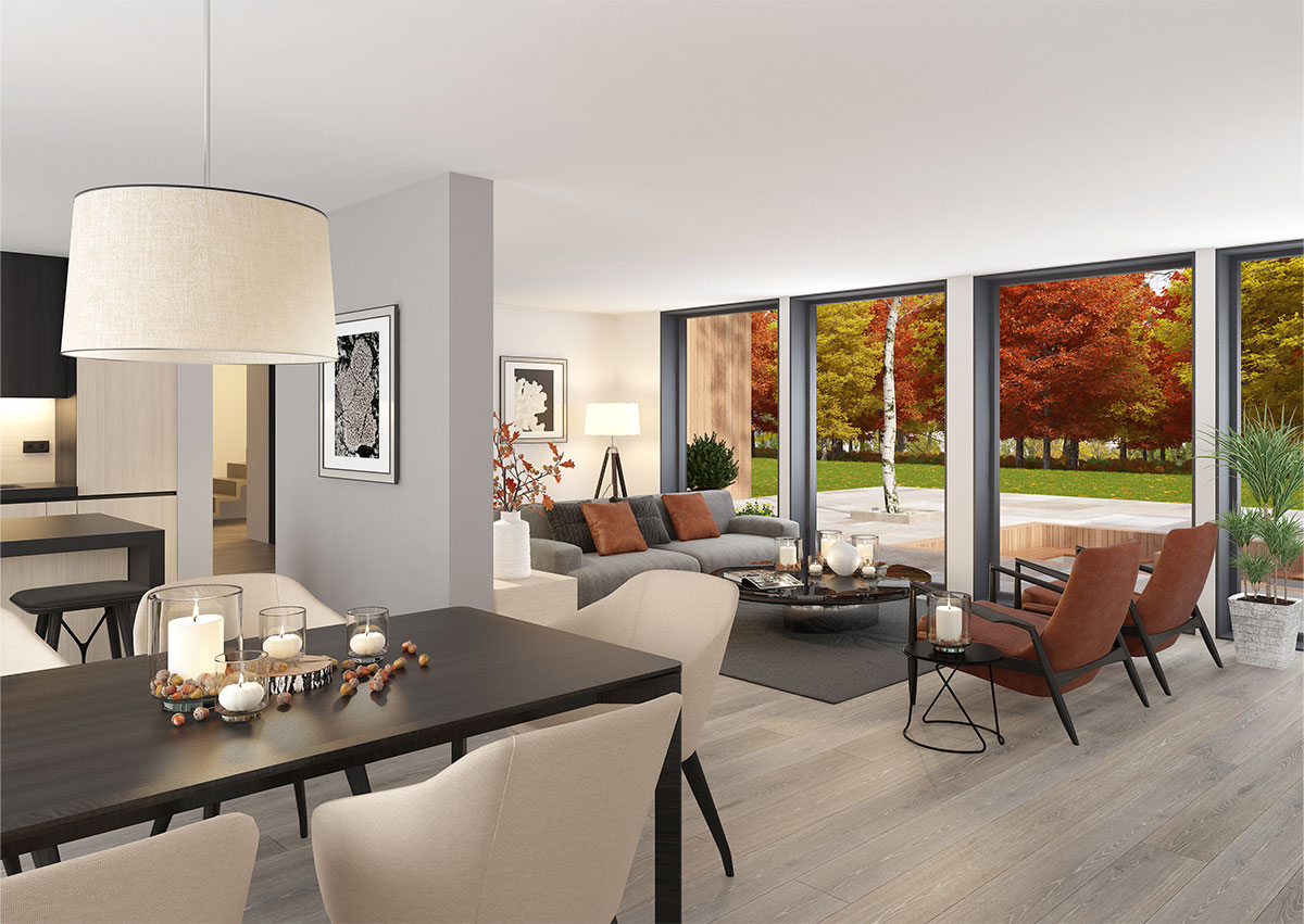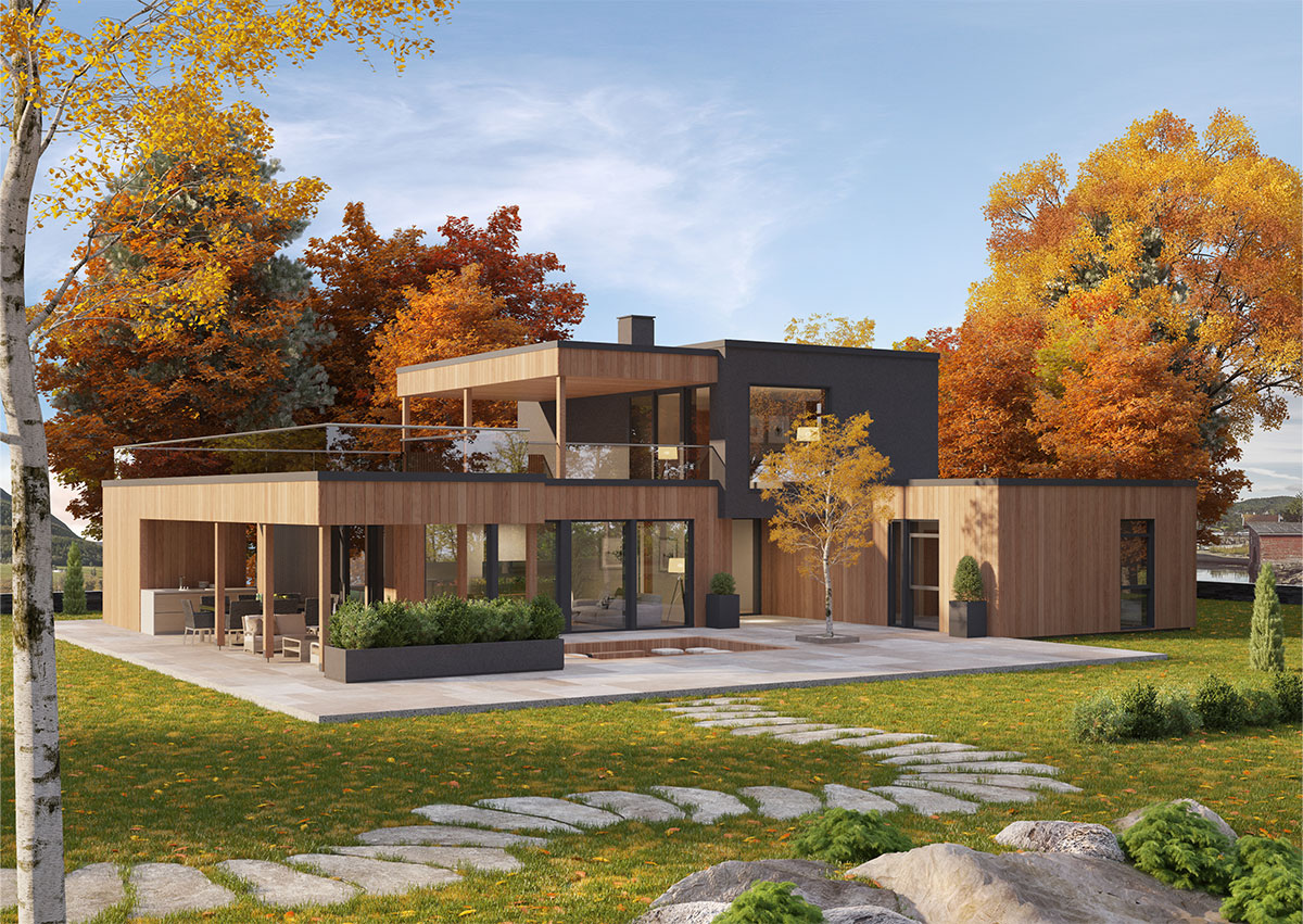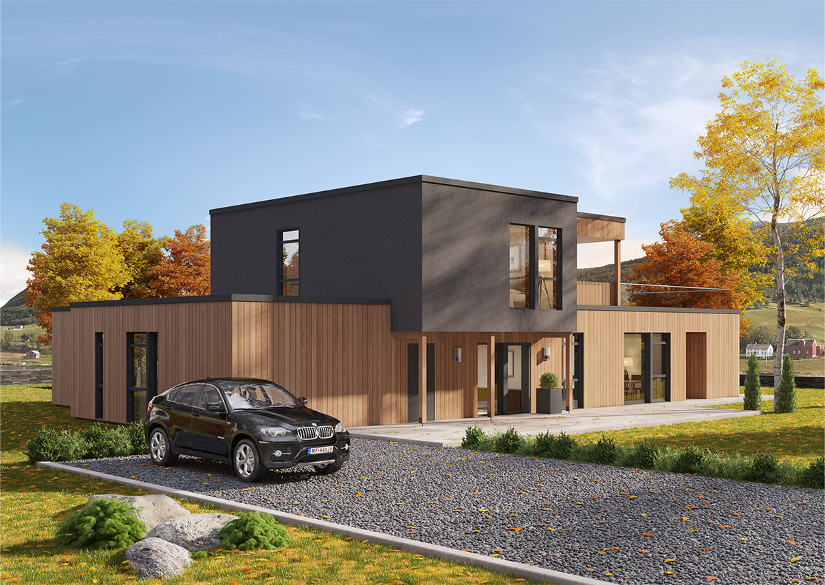 Sagi har en stilren og moderne arkitektur, med store vindusflater som slipper inn rikelig med dagslys. I første etasje ligger et åpent og innbydende allrom, hvor kjøkken, stue og spisestue glir sømløst over i hverandre. Fra oppholdsrommet er det direkte utgang til en stor overbygd uteplass – en naturlig forlengelse av boligens sosiale soner.