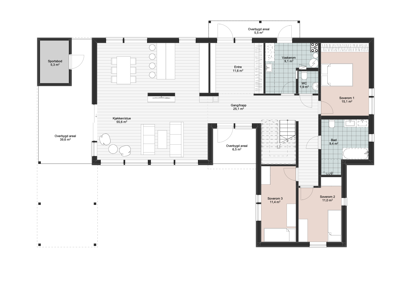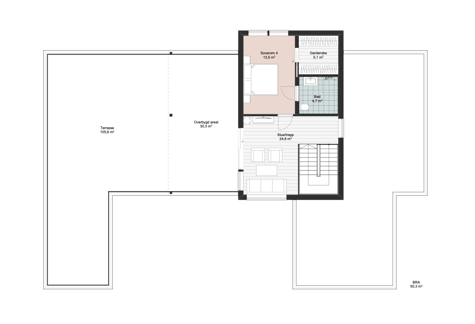 Boligen inneholder totalt fire soverom, noe som gir god plass til både familie og gjester. Det er to bad samt et separat vaskerom, praktisk plassert for en funksjonell hverdag. Andre etasje rommer blant annet et hovedsoverom med eget bad og en romslig walk-in-garderobe. I tillegg finnes det en koselig TVstue i denne etasjen, perfekt for ungdommene i huset. Til tilknytning til TV-stuen er det en stor, delvis overbygd takterrasse.