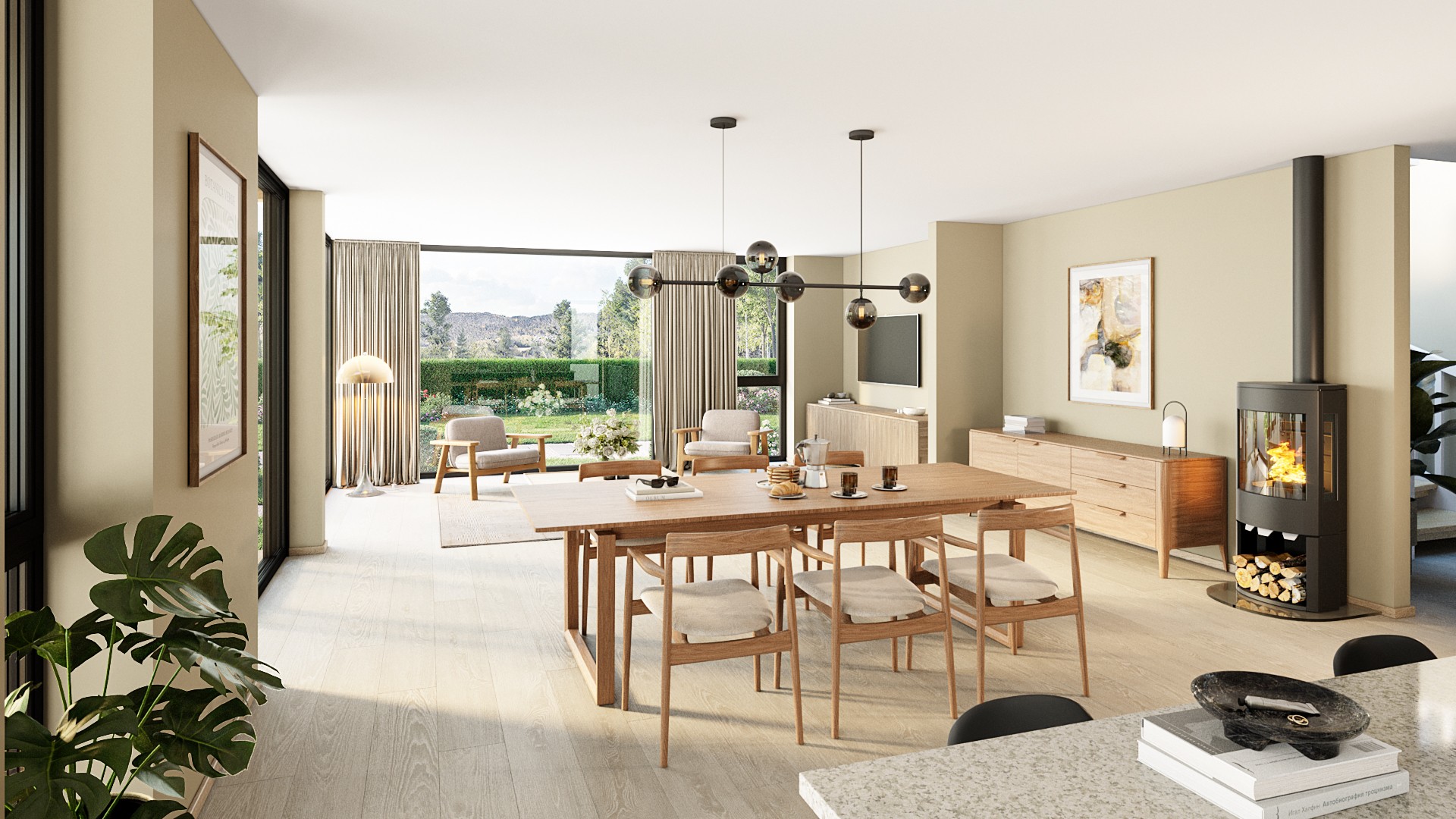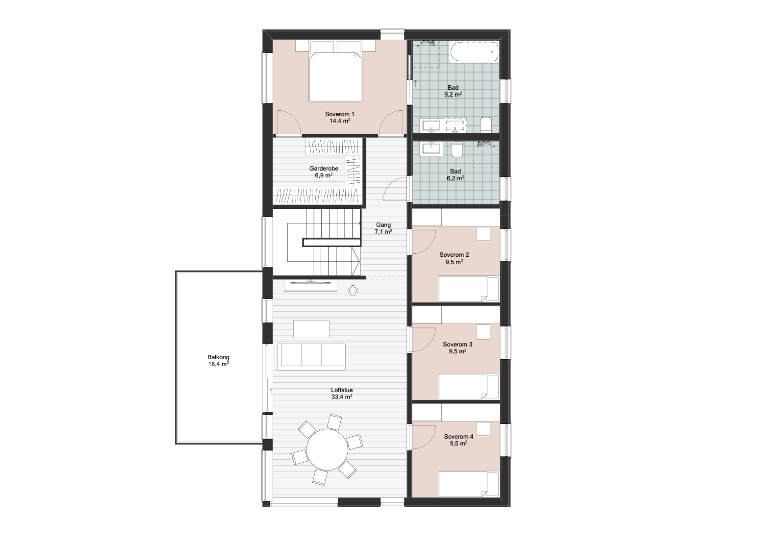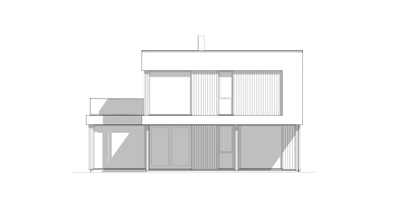 Fra stue og kjøkken er det utgang til en delvis overbygd terrasse. Inngangsplanet har også et bad og en ekstra stue som kan brukes som et fleksibelt oppholdsrom. Dette gir blant annet muligheter for TV-stue, kontor, lekerom eller et ekstra soverom/gjesterom. Andre etasje er mer privat med fire soverom, to bad og en romslig loftstue. Loftstuen har utgang til en takterrasse, som gir et ekstra uterom. Et av badene tilhører hovedsoverommet, som også har egen walk-in garderobe. Skaget har et stilrent uttrykk, med en arkitektur som kombinerer materialitet og rette linjer. Den rektangulære formen gir bygget et stramt og elegant preg, mens de store vinduene sørger for rikelig med naturlig lys.