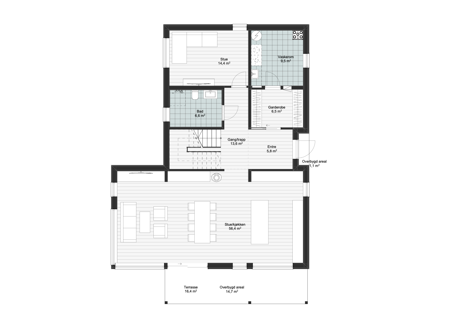 Skaget er en innholdsrik, moderne bolig over to etasjer. Boligen er utformet for å gi god plass og en behagelig romfølelse. Ved inngangen inviteres man inn i en romslig entré med stor garderobe, med direkte forbindelse til et stort vaskerom. Fra inngangspartiet kommer man til en lys og åpen stue- og kjøkkenløsning, som har rikelig med plass til både oppbevaring og eventuelle gjester.
