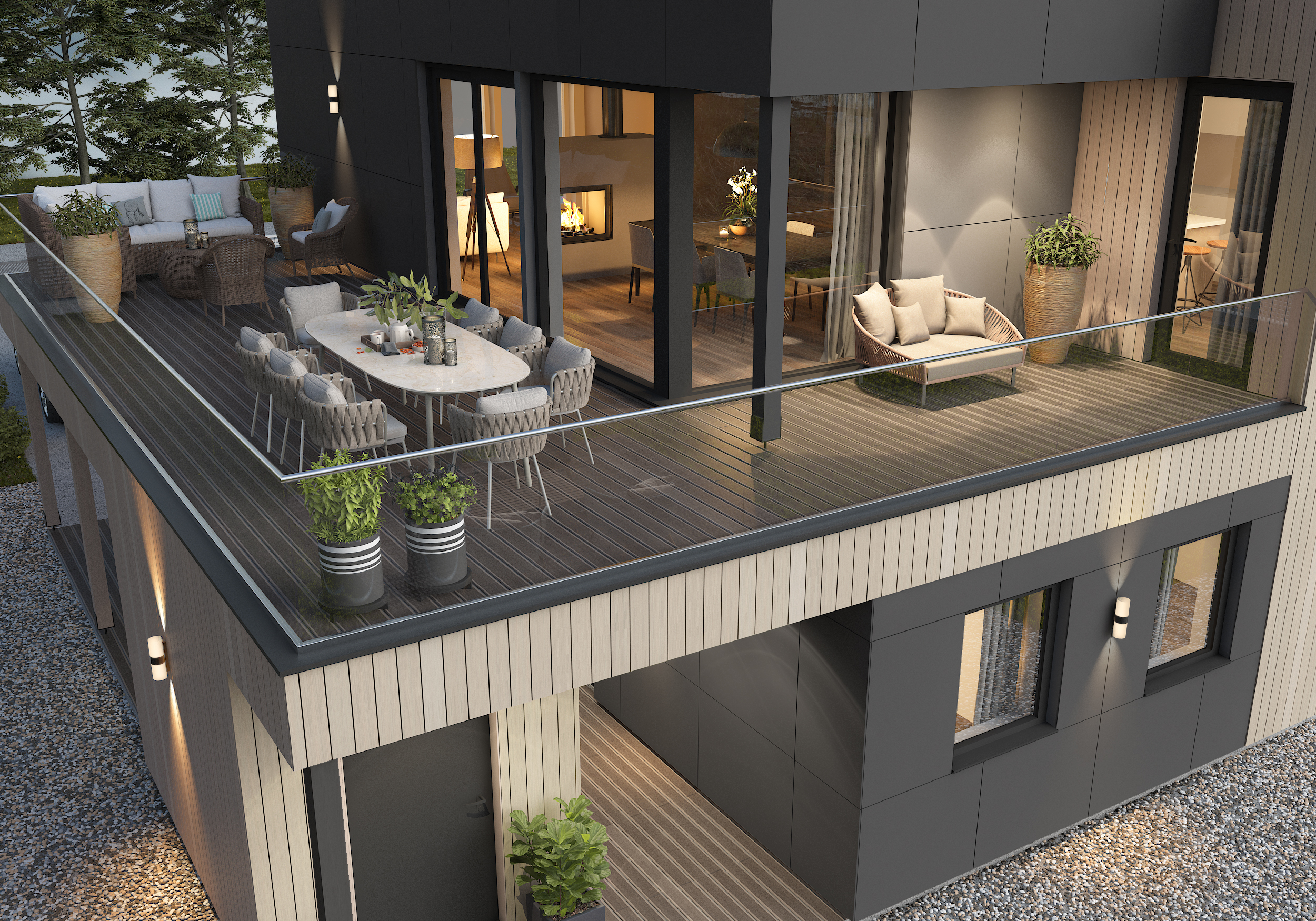 Vesttinden er en moderne og romslig enebolig. Denne boligen kombinerer funksjonalitet med et stilrent uttrykk, og er spesielt tilpasset familier som ønsker god plass og mulighet for utleie. Første etasje inneholder en åpen stue- og kjøkkenløsning som skaper et naturlig samlingspunkt i hjemmet. Store vindusflater slipper inn rikelig med naturlig lys og gir en lys og trivelig atmosfære. Et overbygg gir mulighet for å nyte utendørsarealet uansett vær. Andre etasje rommer soverom og bad, noe som gir en praktisk adskillelse mellom oppholdsrom og private soner.