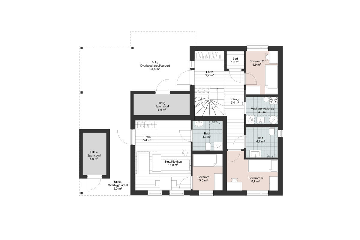 Boligen har også en egen utleiedel, noe som gir mulighet for ekstra inntekt eller plass til gjester. Vesttinden er ideell for familier som ønsker en moderne bolig med smarte løsninger og mulighet for utleie.
