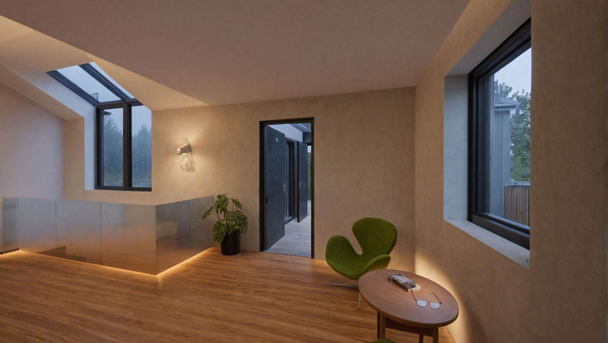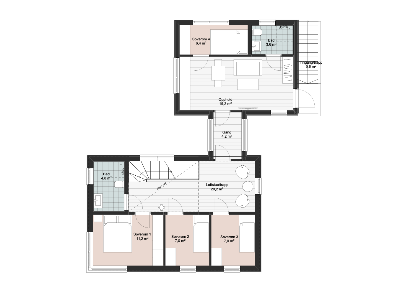 Inngangsplanet rommer en kompakt og åpen stue og kjøkken, noe som skaper en sosial og innbydende atmosfære. I tillegg finnes et separat vaskerom og et gjestetoalett. Et særtrekk med boligen er vinduer i trapperommet som gir ekstra lysinnslipp i begge etasjene. Andre etasje inneholder tre soverom, et bad og en loftstue som gir ekstra oppholdsplass – perfekt som TV-stue, lekerom eller kontor.