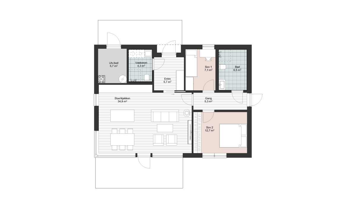 Veslehøa er den minste modellen i en serie på tre, og gir deg muligheten til å velge den planløsningen som passer best til dine behov. Denne utgaven er perfekt for mindre husholdninger, førstegangsetablerere eller for deg som ønsker en arealeffektiv bolig uten å gi avkall på komfort og kvalitet.