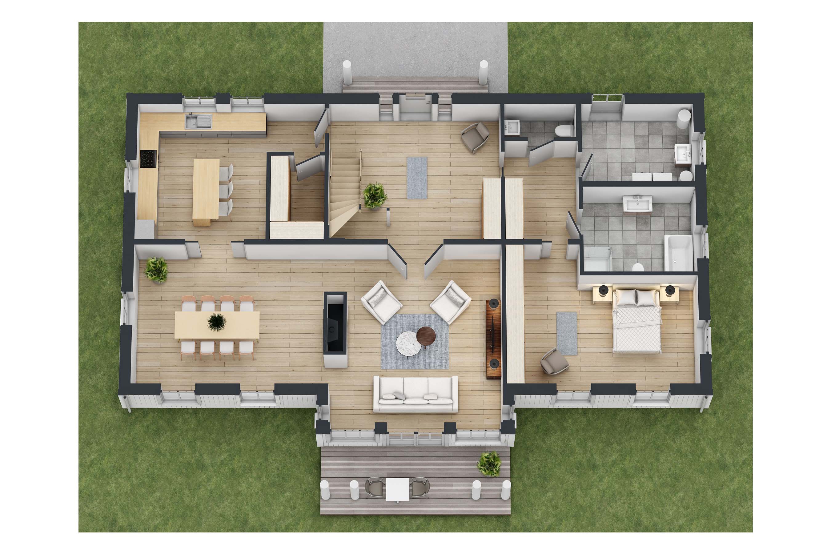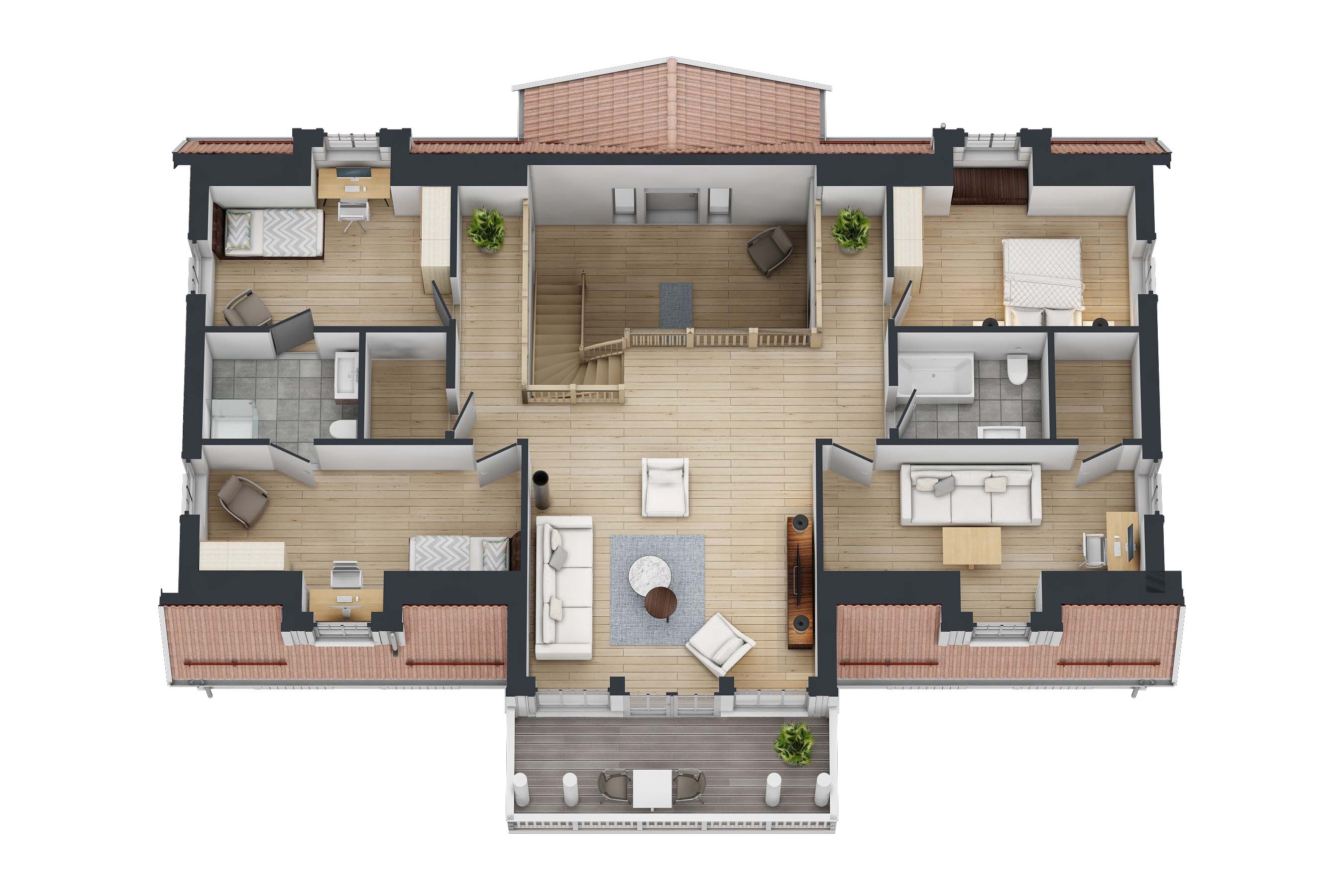 – En herskapelig hall med dobbel takhøyde fungerer som et knutepunkt mellom de ulike sonene i boligen. 2. etasje har en luftig loftstue og romslige soverom med et fantastisk lysinnslipp via kobbhusene i mansardtaket.